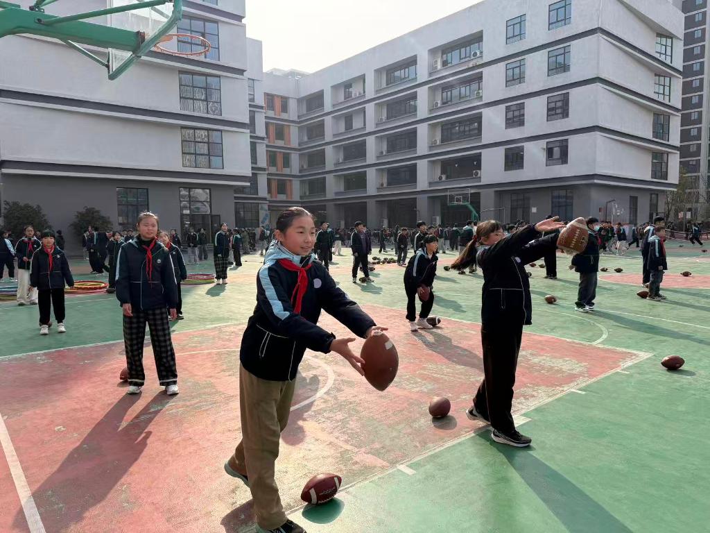 学生们有的排成两队接力抛接橄榄球