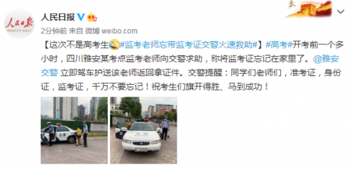 高考开考前一个多小时,四川雅安某考点监考老师向交警求助,称将监考证忘记在家里了。雅安交警 立即驾车护送该老师返回拿证件。交警提醒:同学们老师们,准考证,身份证,监考证,千万不要忘记!祝考生们旗开得胜、马到成功!