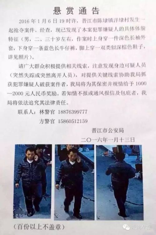 今天上午,东南早报记者从晋江滨江派出所获悉,嫌疑人在案发时徒步抢夺受害者的手提包,包内有手机现金等物品。目前,警方已经锁定嫌疑人体貌特征,正全力抓捕中。