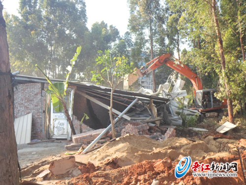 树林中抢建,还是逃不过执法人员的巡查。日前,灵源行政执法中队组织行动,拆除小布林社区一宗违建,拆除面积约500平方米(如图)。据悉,该违建位于一片茂密的桉树林中,业主利用这一隐蔽的场地正在抢建铁皮搭盖。(记者 胡志法 通讯员 陈育群 文图)