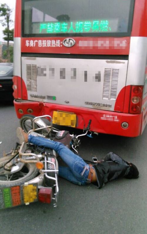当天下午3点20分,记者现场看到,一辆摩托车倒在一辆车牌号为闽C6xx14的公交车后,一名20多岁的男子,一只脚被压在摩托车下,头上流着血,手脚正痛苦地抽搐着,掉在一旁的手机则一直在响。