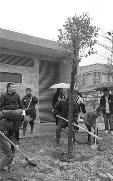 当天下午,尽管天公不作美,下起了滂沱大雨,但磁灶海峡国际五金机电城内的区间绿地里,依旧是一派热火朝天的景象。挖坑、培土、浇水……参加当天活动的30多位党员相互配合,亲手栽下了一株株的绿树。(记者 赖自煌 通讯员 苏佩玲 文图)