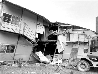 罗山社店社区一家食品企业厂区内,业主认为厂区较为隐蔽,利用雨天伺机抢建。不料,还是被执法人员巡查发现。当日下午,该中队还对山仔社区一幢占地约150平方米的二层活动板房进行强制拆除(如上图),狠刹抢建歪风。