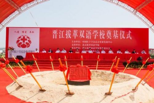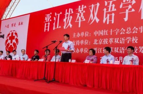 奠基仪式上,中国红十字会总会事业发展中心主任江丹表示,目前,事业发展中心已在全国多个城市建立了多所“拔萃”学校,打造了“拔萃”公益教育品牌。资助家庭贫困、品学兼优的“红萃生”2500多人次,资助金额1400多万元。同时,中心在全国部分省市贫困地区兴建了多所“拔萃公益小学”;实施了“拔萃助学、奖学、奖教金项目”。“拔萃”教育的探索与实践引起了教育部等有关部门的高度重视,教育部部长袁贵仁对拔萃双语学校的办学模式及成功经验曾给予充分肯定。“晋江拔萃双语学校建成后将为品学兼优、家庭条件特别困难的孩子提供免费和优惠的教育培养。”