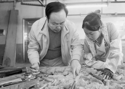 郑银聘(左)在传授徒弟雕刻技艺。刘深魁 摄