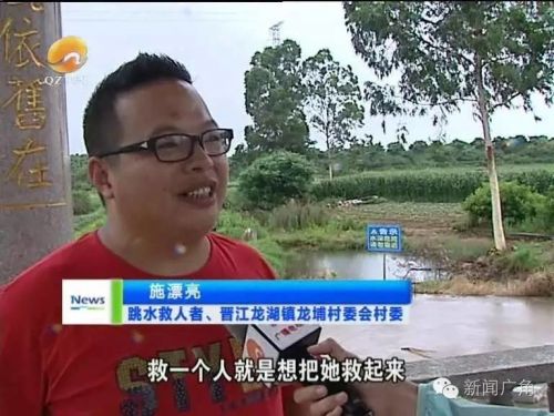 跳进池塘中营救的白衣男子名叫施漂亮,也是龙埔村的村民。当时他在远处听到有人在大声呼救,猜到一定是出事了,就赶紧骑着摩托车赶到现场。此时,阿婆整个人已没入水中,只露出了一点白头发。