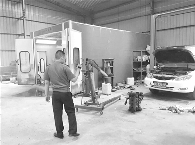 15日下午,执法大队三中队接到群众举报,赶往东石下庄村这家汽修厂时,发现该厂不仅外面有广告牌,厂房内还有烤漆房、升降机和修车等设备。几名工人正在维修两部小车,而厂房内还停了多部小车,看上去生意兴隆。