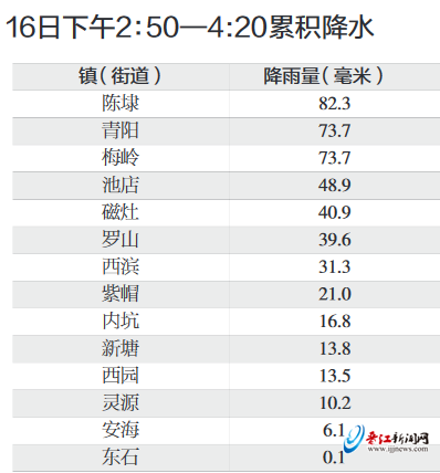 雨水带来摧枯拉朽之势,让人再次感受了一把雨水的威猛。昨日下午2:50至4:20,不到两小时的时间内,陈埭镇降雨量最大,达到82.3毫米;并列第二名的是青阳和梅岭,为73.7毫米;以上三个镇街降雨量达到暴雨水平。