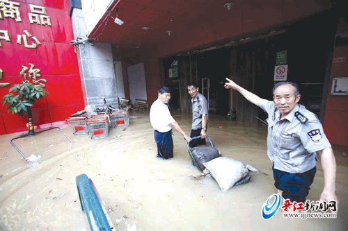 昨日下午5时30分许,记者在福隆广场地下商场的义乌小商品市场看到,商场里一片漆黑,积水至少30厘米高。商场入口用沙袋及手推车挡住,商场里面的员工已全部撤离到外面。义乌小商品市场一名员工说,大水一直淹进地下商场,不到20分钟,整个商场水漫金山。当时,商场方面立即切断电源,一边组织人员排水,一边将员工疏散到安全地带。