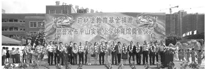 昨日,祖籍晋江梅岭街道三光天社区的旅菲华侨庄炳生带着宗室兄弟及家眷回到故乡,出席由他设立的“庄材塗教育基金”捐赠暨晋江市平山实验小学体育馆奠基仪式,并向梅岭街道教育基金会捐赠300万元人民币。