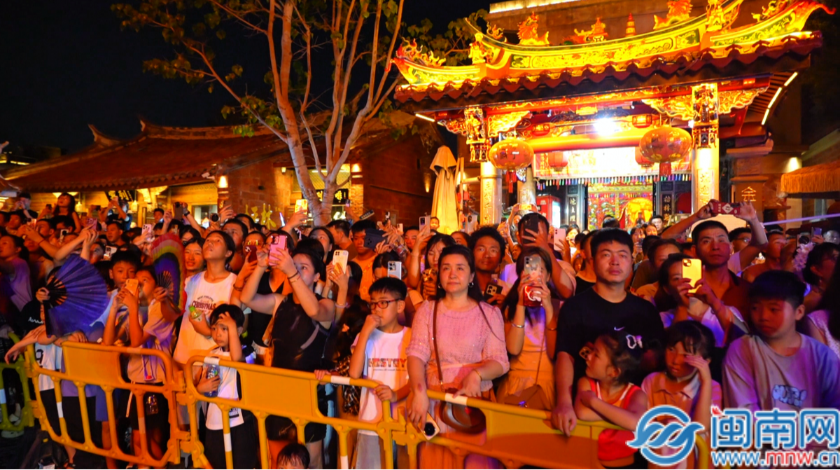 晚上6时30分许,夜光舞龙在草坪上穿行,在夜色中流动,光影交织,如梦如幻。现场人山人海,连古厝的露台上都站满了观众,大家纷纷举起手机拍照打卡。当夜光舞龙在一片欢呼声中淡出场地,紧随着便是古老的烧塔仔仪式。