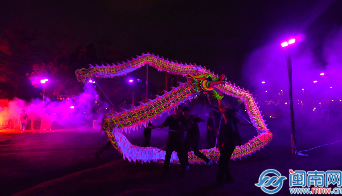 火焰跃动,夜光舞龙,表演助兴令游客流连忘返。月光如水,洒在每一个幸福欢笑的脸上,呈现出一派繁华热闹景象。