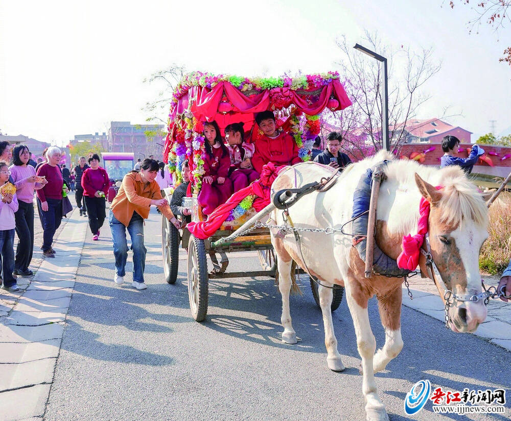 大年初一清晨,九十九溪田园风光区田埂上便热闹了起来。晋江马保种场工作人员牵着8匹装扮一新的晋江马准时出现。这些马儿头戴红花、身披红绸,眼神温顺,在人群中缓步穿行,瞬间成为现场焦点。“没想到来九十九溪玩,我竟体验了人生第一次坐马车,感觉很新奇。”来自安徽合肥的游客徐先生难掩兴奋,“刚坐上的时候比较紧张,后来逐渐适应了。我在马车上享受大自然风光,体验感很棒。”