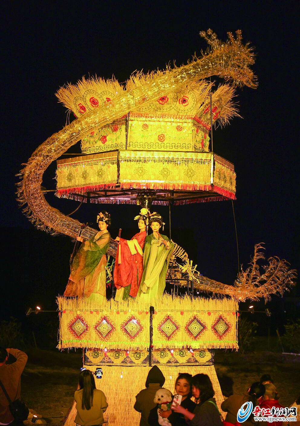 这座艺术装置,远远望去像一盏巨大的闽南传统走马灯,又像一座旋转木马,还像一个等待着好戏开场的乡村舞台。走近细看,其中蕴含的巧思令人拍案叫绝。“这是这片农田给我的启发。”该装置创作者宝小格现场分享时表示,装置主结构采用稻草进行编织,“这相当于花灯的布面,保留了土地最原始的温度。”而装置上流光溢彩的装饰,是日常生活中随处可见的瓶盖、塑料瓶、茶叶包装袋。“我用了一些非遗技法,以及民间技艺进行结构重组。”宝小格希望通过这些方式,让非遗技艺在新时代焕发魅力,同时传递“龙马精神”与晋江精神融合的祝福。