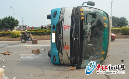 昨日下午1时40分许,在晋江罗山街道内塘加油站附近,发生惊险一幕,一辆客车侧翻,还好车上15人都无大碍。