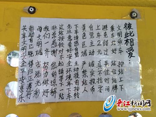 “文明乘车,按站上下。”“下车请你自觉主动提前按铃。”“过站按铃,对不起,请等下一站。”……晋江一辆28路公交车上贴着一张温馨的提示标语,与众不同的是,上面的14行字,都是由该公交车司机庄建阳手写而成。