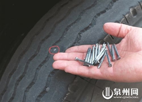 上午9点多,王师傅的挂车正停在晋江罗山街道一仓库卸货。王师傅说,这18枚钢钉插得比较浅,容易拔出来,轮胎上还有10多枚钢钉,插得很深,他担心拔出来车胎的气会很快漏光。记者看到还有十多枚钢钉扎在车胎里,只露出钉帽,其中有一个轮胎漏气严重,已经瘪了。