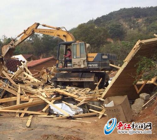 晋江罗裳山上,竟然有人毁掉林地抢建“木头房”。27日,罗山街道联合晋江市治违办、市行政执法局、市国土资源局、市农业局执法大队、罗山派出所、供电所等相关部门开展大型拆除行动,出动人员约150人,大型挖土机2部,对罗裳山上曾某4幢违法建筑物依法强制拆除,拆除面积508平方米。晋江市治违办、罗山街道等单位主要领导现场指挥拆除行动。