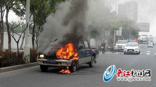 昨日上午9时许,晋江青阳街道长兴路宝龙城市广场对面一辆皮卡车发生自燃,车头发动机位置起火(如图),晋江消防青阳中队及时赶到将火扑灭,火灾未造成人员伤亡。