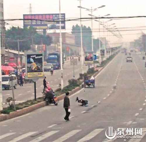 昨日上午7时30分,在晋江安海镇林厝村菜市场路段,杨女士横穿马路要去买早餐时,被一辆摩托车撞上,导致双方三人受伤。事发情景被现场监控完整拍下。