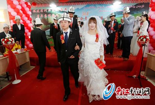 新郎们身穿黑色西服,头戴民族传统的白毡帽,而新娘们身穿婚纱,个个满脸幸福的微笑。几乎所有在晋江务工的柯尔克孜族人都赶过来,共450多人,为新人送祝福。婚礼现场还举行了柯尔克孜族民族歌舞表演。