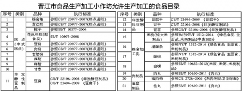 记者昨日从晋江市食药监局获悉,依据《福建省食品生产加工小作坊监督管理办法》(省政府令第124号)第九条规定,设立食品生产加工小作坊应依法取得食品小作坊生产加工条件核准证。食品生产加工小作坊未取得生产加工条件核准证,不得从事食品生产经营活动。日前,泉州市政府已批准两批小作坊允许生产加工的食品目录,其中允许晋江辖区小作坊生产加工的食品目录有豆腐、豆饼、猪肉粕等21种(具体品种见附表)。