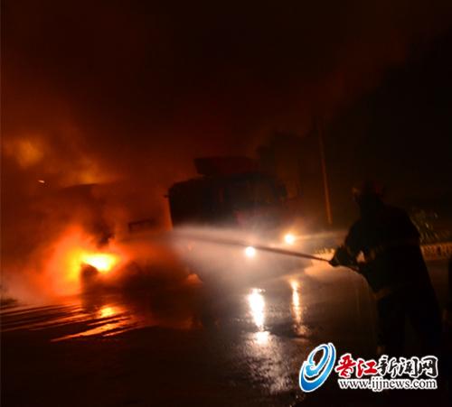 晋江消防大队接到报警后,立即调集青阳中队1部水罐车7名消防官兵前往现场进行扑救。到场后,消防官兵发现一辆牵引车正停在道路中间隔离带边,车厢运载两块大石料,车辆右侧轮胎正在熊熊燃烧,现场夹杂着刺鼻的烧焦味。经过5分钟紧急处置,火势被成功控制。