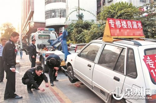 4月12日,晋江交管部门接到群众举报,称在新华街中国银行门口、晋江市医院灯控路口,有2辆“僵尸车”长期占用公共停车位。交警赶到现场发现,这2辆“僵尸车”车顶、前挡风玻璃、车身均安装、粘贴有“专修楼房漏水”的广告信息,不仅车胎都蔫了,车子底盘也用砖头垫起,已无法正常行驶。经了解,这2辆“僵尸车”在此停放已有一个多月,民警对其进行强制拖离。