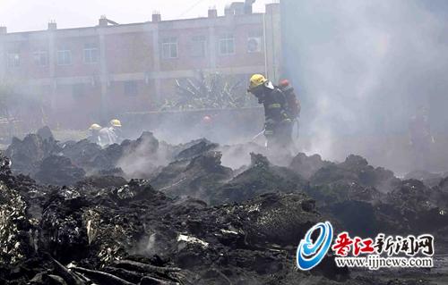 昨日11时许,晋江陈埭镇晋新路一塑胶公司的露天鞋材堆垛突发大火并迅速蔓延,巨大的黑色浓烟在数公里外可见。经过1个小时奋战,大火被成功扑灭,火灾未造成人员伤亡。