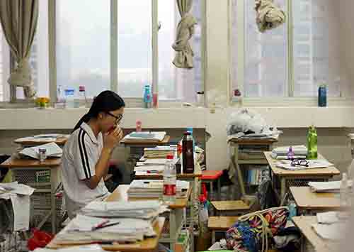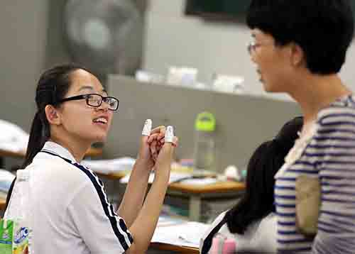在高三教室里,一位女生向老师展示她带在拇指上的小玩意儿。在复习备考的紧张气氛里,一点点有趣的东西都会给考生们带去欢乐。
