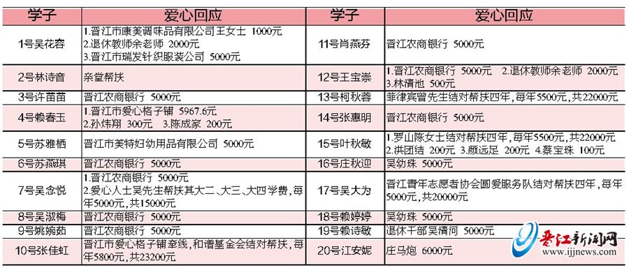 除了海内外晋江爱心人士的积极参与,晋江农商银行、晋江市爱心格子铺、晋江青年志愿者协会圆爱服务队、和谱基金会等爱心团体也纷纷加入爱心联盟。其中,晋江农商银行“福万通”慈善基金此次共捐助奖励8名励志学子。