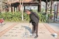 晋江市竹树下公园,一位老人单手拿着一支形似毛笔的长棍,用笔在桶里沾下水,在地上挥毫写下毛泽东的诗句“风雨送春归,飞雪迎春到……&rd