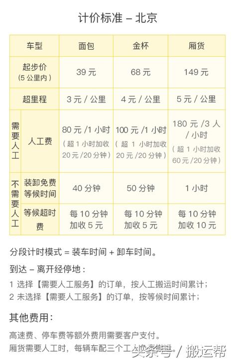 在北京地区搬运帮以面包、金杯、厢货作为主要的搬运工具,起步价分别为39元、68元、149元超出5公里后的价格分别为3元、4元、5元/公里。人工费以每小时计费。分段计费的模式为装车时间和卸车时间之和,消费者可以根据实际情况选择是否需要人工服务。