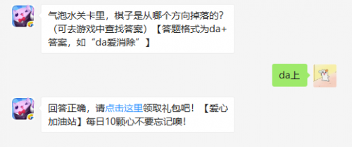 气泡水关卡里,棋子是从哪个方向掉落的?(可登录游戏查找答案)【答题格式为da+答案,如“da爱消除”】在天天爱消除手游中,是有一个特殊的水元素的,很多玩家对于这个气泡水元素还不是特别了解,今天每日一题也给玩家带来的关于气泡水的有关问题,在每日任务中,气泡水关卡里棋子是从哪个方向掉落的?很多玩家都想知道,今天小编便给大家带来天天爱消除手游气泡水关卡的详细解读,一起来看看吧。