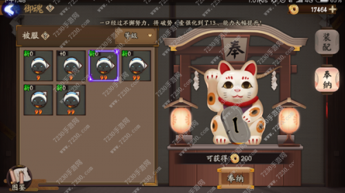 在御魂界面上有个装配,这是以前就有的功能了,现在在装配御魂下面多了个奉纳,这就是我们的御魂回收了,说是将我们的御魂奉纳给招财猫就可以兑换到奖励了!