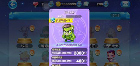 绿巨熊的技能是登场效果:冲刺破坏障碍物加 2800分;