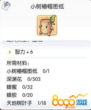 小树椿帽所需材料:1张小树椿帽图纸,503个深渊花,32个蜂蜜,20个蜂胶和18个天地树叶子。完成古城81级任务后找到商人即可购买图纸,解锁条件就是81级的任务。