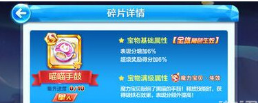 喵喵手鼓是魔力宝贝的单人专属,满级后可使魔力宝贝释放技能时获得吸铁石效果,并提升表现分。