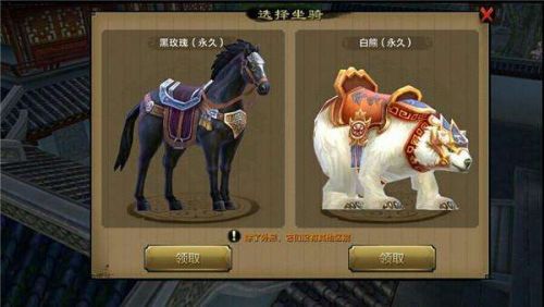 当玩家通过主线任务达到12级之后,可以在苏州府尹“蒋忻”处接到任务【宝马良驹】,这个任务不必玩家去杀怪采集,就可以领取永久的免费坐骑“黑玫瑰”或者“白熊”,二者只能选其一。