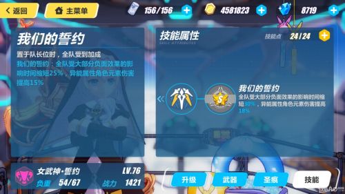 我们的誓约:全队受大部分负面效果的影响时间缩短25%,异能属性角色元素伤害提高15%(S级解锁)