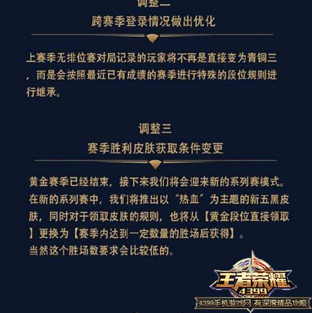 S8赛季暂定于7月4日开启(战队赛一起更新),S8赛季皮肤不再是黄金王皮肤,改为热血主题的皮肤,所以之前有人提到的李白酒仙王是不存在的,获取方式也更简单,只需要排位获胜十几二十把即可。