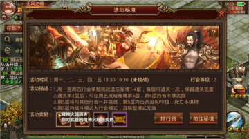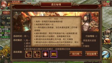 每周一至周四每一个行会可以自行单独挑战遗忘秘境的1-4层,每一层可以通关一次,可以自由保留通关的进度,当日没有通关成功可以继续挑战哦。通关之后就可以进入下一层,每一层的情况都有所不同,但都需要经历BOSS战,击杀BOSS就是我们通关的目标。过程中会遭遇各种小怪和带有特殊效果的怪物,所以一定要整个行会齐心协力才能成功通关哦。通过了前四层的考验,才可以进入到第五层的全服挑战之中,在这里可以自由PK而不受PK值影响,死亡也不会掉落东西。死亡需要复活石才可以复活,并且需要注意的是这里没有联盟,强制行会模式战斗哦!第五层可以通过击杀小怪和BOSS来获得积分,积分有着相应的奖励。