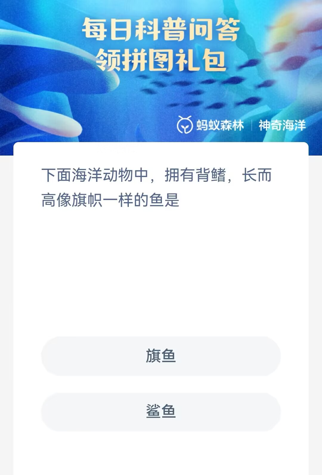 背鳍长而高像旗帜一样的鱼是什么鱼,神奇海洋是支付宝蚂蚁森林中推出的新玩法,除了收集能量种植外,还可以通过答题等一系列玩法来获取免费的海洋碎片,集齐碎片就可以合成啦,喜欢的小伙伴赶快来看看神奇海洋5月28日答案最新吧。
