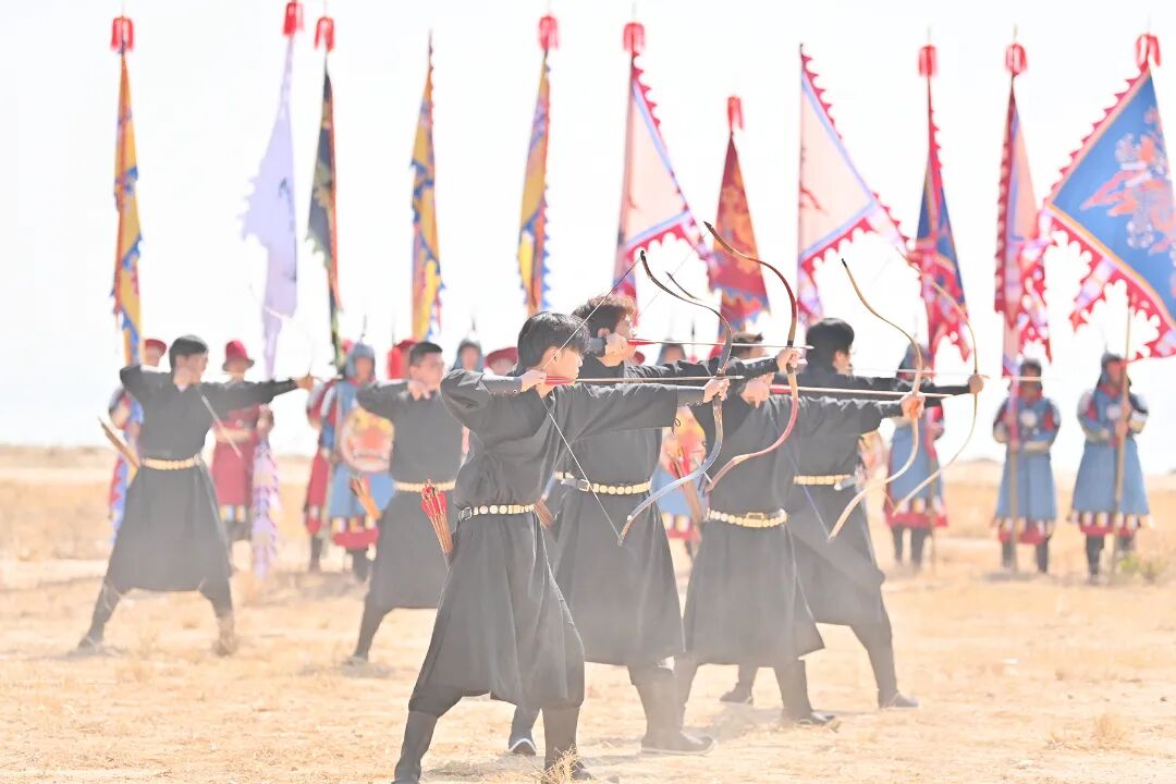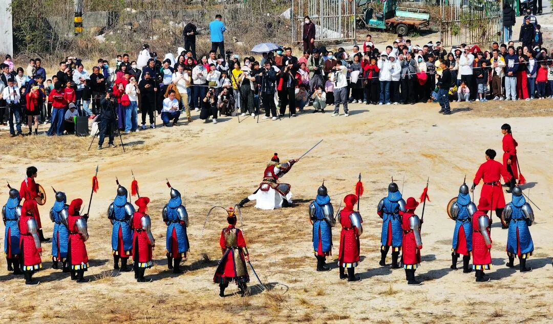 抵达展演点,一面面精心复刻的明代军旗迎风招展,猎猎风声与将士的呼喝声交织,氛围感瞬间拉满。随着一声号令响起,将士们凝神聚力,依次展示各类武打招式、射箭技艺、古代阵法变化等,动作刚劲有力、行云流水。当战士们在展演场上策马驰骋时,展演迎来最高潮,马蹄扬尘、甲胄生辉,将当年郑家军冲锋陷阵、骁勇善战的模样展现得淋漓尽致。