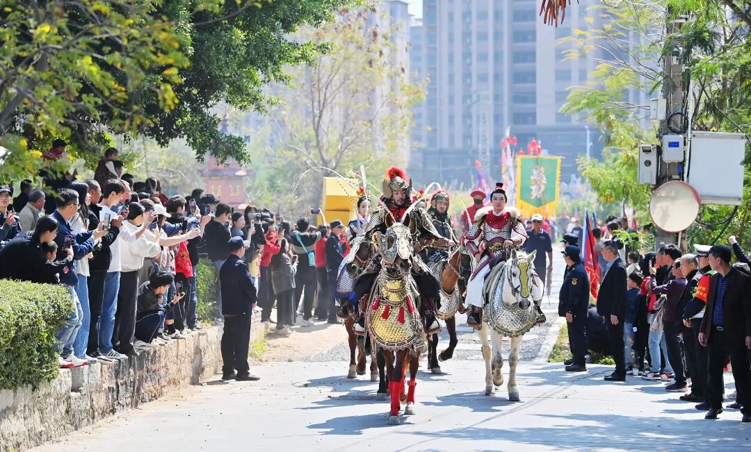 “本场展演融合多元文化,除了核心的甲骑具装展示,我们还精心编排了骑阵、箭阵、武备演示等精彩节目,同时融入十二花神、石井岑兜高甲戏等民俗非遗元素。”陈康表示,这样的编排,既复刻了当年郑成功练兵视师的历史场景,又将郑成功这一历史IP,与高甲戏等本土非遗表演形式有机结合,让现场观众在行走间、观赏中,近距离触摸历史、感受文化。