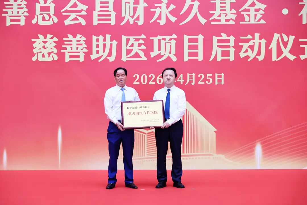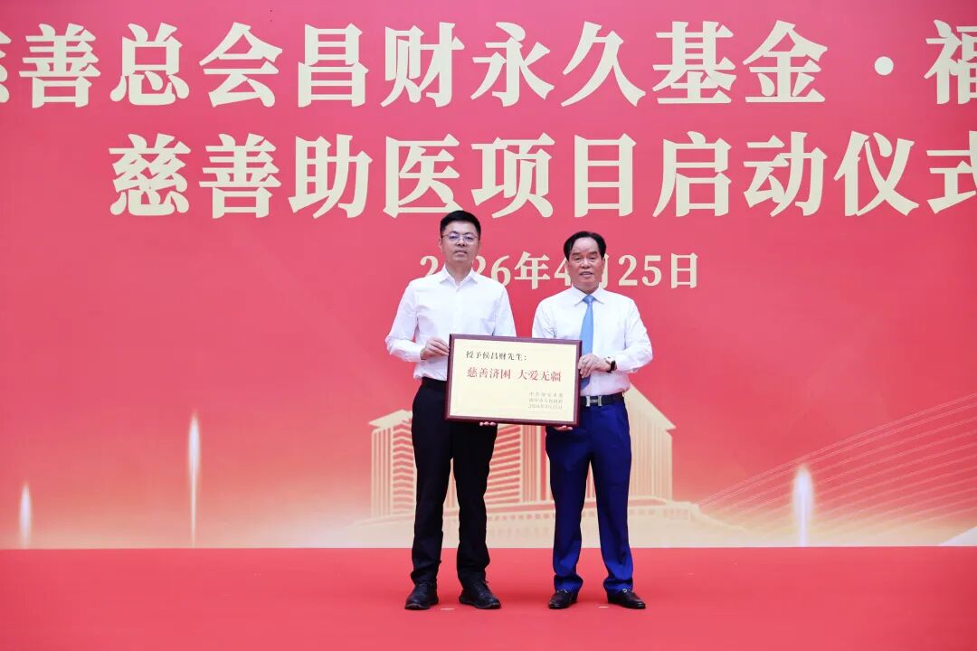 南安市市长王连赞代表市委、市政府,向侯昌财授予“慈善济困、大爱无疆”荣誉牌匾,表彰其公益善举;南安市慈善总会昌财永久基金向福建昌财医院授予“慈善助医合作医院”牌匾。