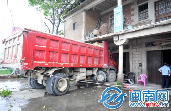 闽南网5月21日讯 昨日下午2时许,324国道南安官桥镇路段,一辆满载沙土的土方车,一头扎进路边民房内,导致民房的一面石墙倒塌,4米高的石头横梁也被撞断。万幸的是,事发时,民房内一对母女在二楼午休,躲过一劫,而土方车司机也只受了轻伤。