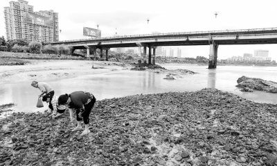 走到西溪边上,记者发现因为水位下降,西溪部分河道裸露出来,形成了大片滩涂。有10多名市民不顾危险,在滩涂上捡沙螺。