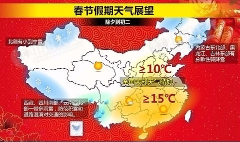 新春佳节将至,全国各地张灯结彩,大街小巷洋溢着新春的喜庆气氛。中央气象台预计,春节假日期间(除夕至初六),我国大部地区气象条件总体较好,无寒潮、持续低温雨雪冰冻和严重雾霾天气,气象条件总体适宜外出活动,大部时段能见度在5公里以上,对铁路、航空及水运等交通基本无影响,节日后期雨雪和大雾天气可能影响公路部分路段。