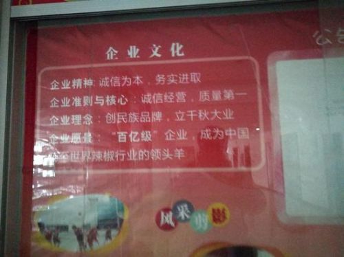 在3楼的公告栏中,老干妈也仅仅是以企业精神、企业准则与核心、企业理念、企业愿景来阐释企业文化。企业愿景部分,老干妈是“百亿级企业,成为中国乃至世界辣椒行业领头羊。”